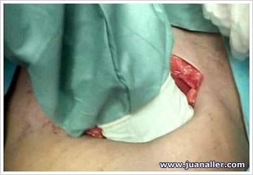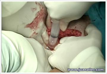 Una vez abierta la cavidad abdominal se debe aspirar el líquido libre en cavidad o en su ausencia instilar unos 10 cc de solución salina y volver a aspirar el fin de practicar una citología para identificar potenciales células malignas que cambian el estadio de la enfermedad. Luego se procede a la extirpación del tumor como aparece en la siguiente secuencia fotográfica.